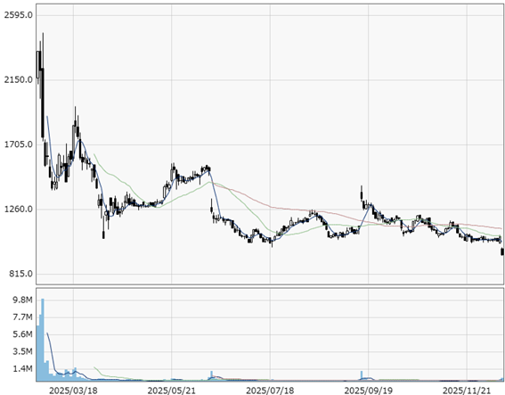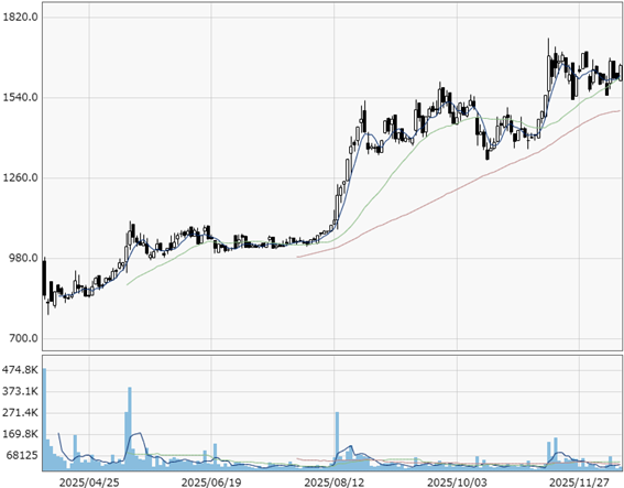 スタートは躓いたものの、その後は順調に上値を伸ばしました。2025年12月15日の終値は1653円となっており、2025年11月13日に付けた上場来高値1750円に接近しています。