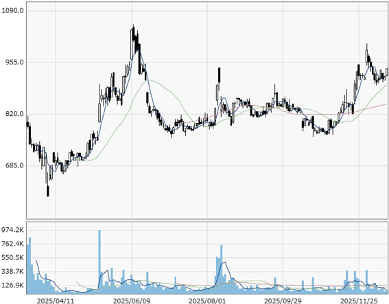 2025年12月15日の終値は940円となっており、2025年6月10日に付けた上場来高値1056円に接近しています。
