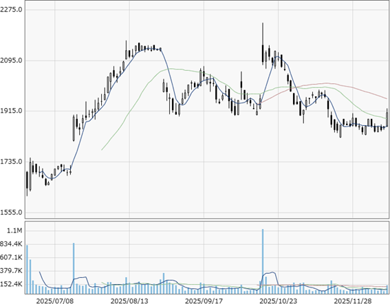 2025年12月15日の終値は1910円となっており、2025年10月16日に付けた上場来高値2230円に接近しています。