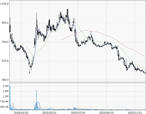 2025年12月15日の終値は448円となっており、2025年4月7日に付けた上場来安値443円に接近しています。