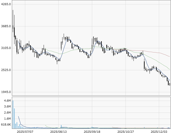 2025年12月15日の終値は2177円となっており、同日に付けた安値2108円が上場来安値となっています。