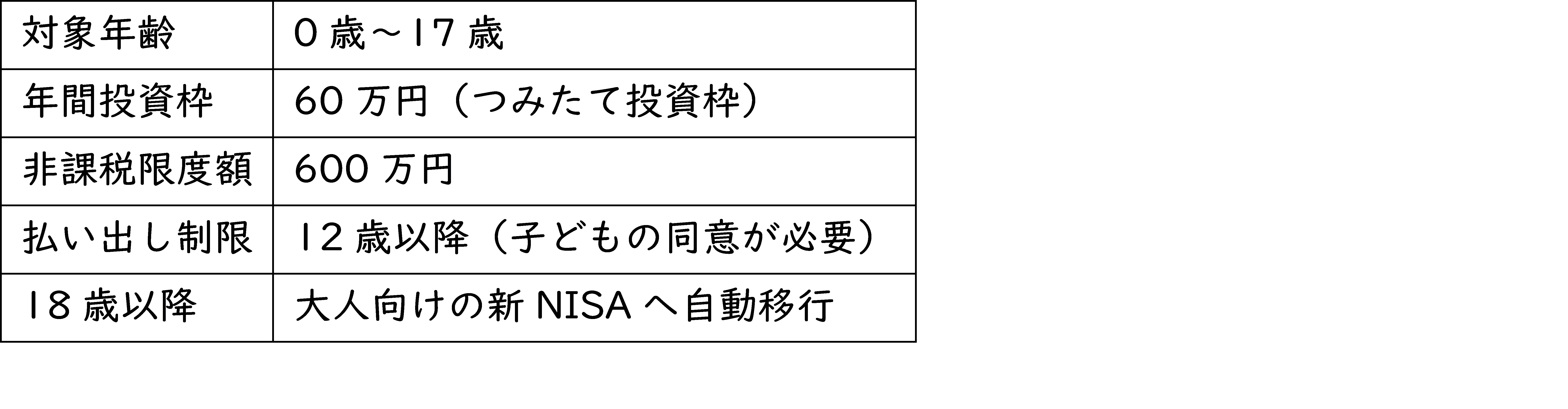 親が自分のNISA枠(最大1,800万円)とは別枠で、子どもの将来のための資金を非課税で準備できるというメリットがあり、子どもにとっては親と一緒に投資を体験することで、金融リテラシーの向上が期待できます。