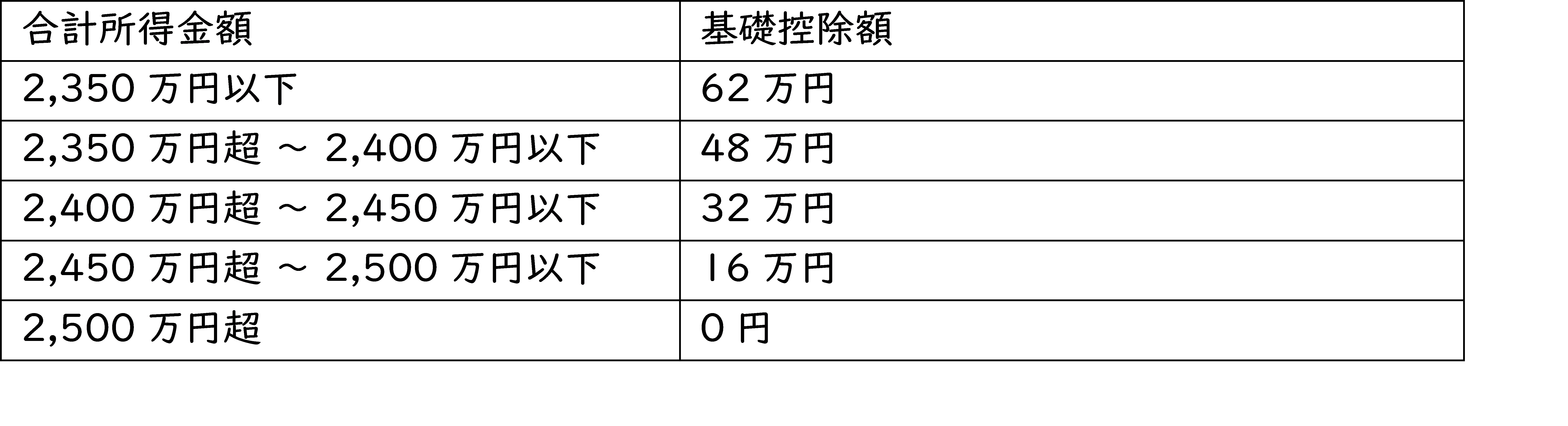 あわせて、合計所得金額2,350万円以下の個人は基礎控除を4万円引き上げ、所得区分に応じた新たな控除額を設定します。