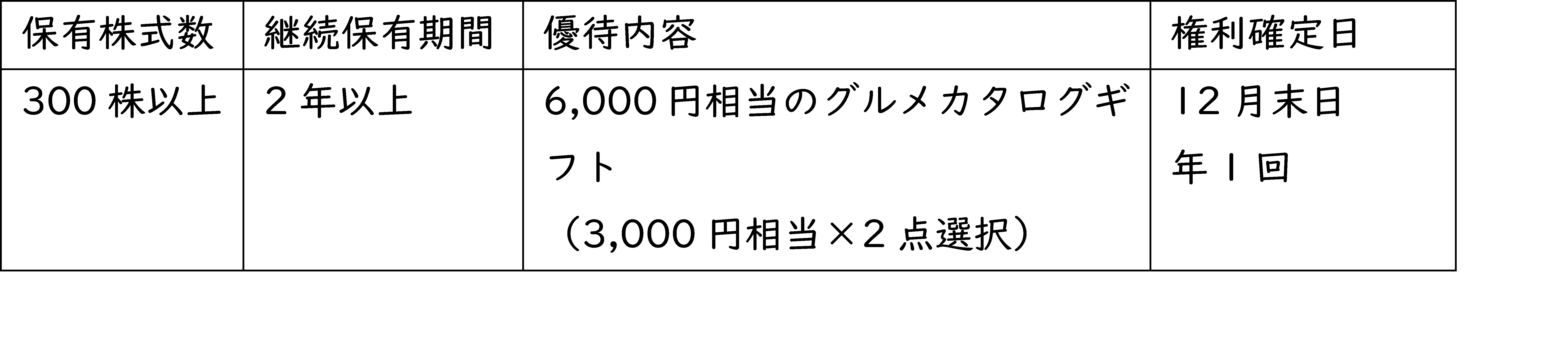 毎年12月末日現在の株主名簿に記載または記録された株式300株以上を2年以上継続して保有する株主を対象に、株主優待を実施しています。