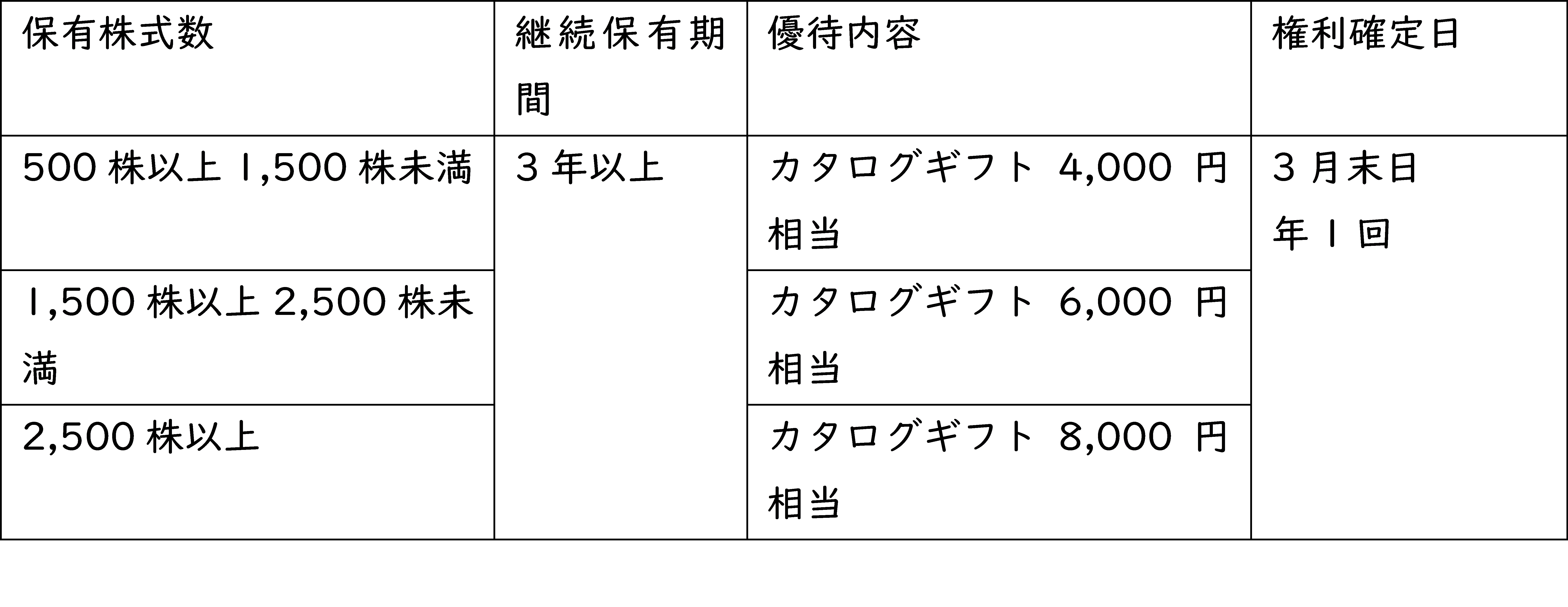 株主優待は、毎年3月末日現在の株主名簿に記載または記録された株式500株以上を保有する株主が対象です。