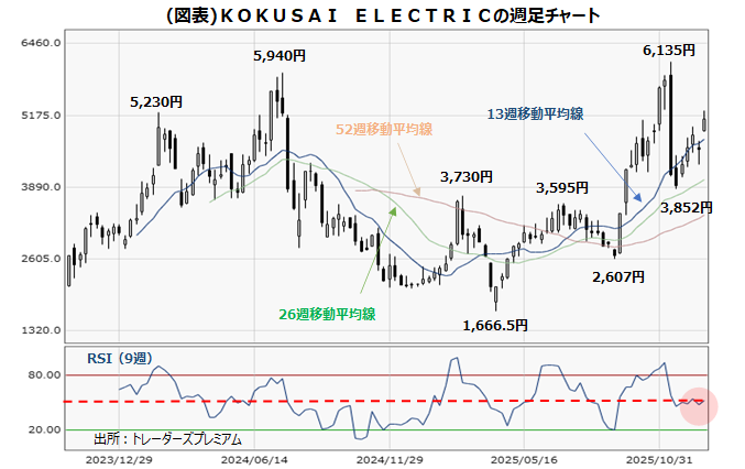 図表は、KOKUSAI ELECTRIC(6525)の2023年10月の上場時からの週足のローソク足に加え、13週・26週・52週移動平均線を挿入したチャートです。下位は、売られ過ぎや買われ過ぎ、勢いなどをみるオシレータ系指標で代表的な相対力指数のRSI(9週ベース)の推移です。