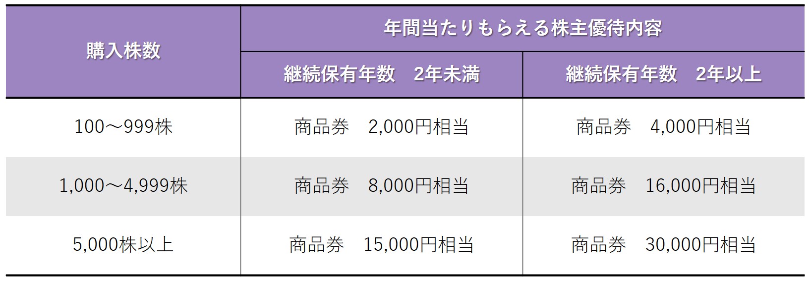 商品券は、オンラインストアもしくは国内実店舗で利用できます。保有株数および保有年数に応じて贈呈される株主優待の内容は、下記の一覧表をご確認ください。