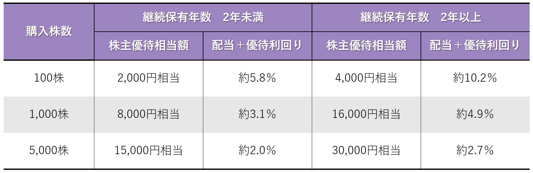 保有株数および保有年数に応じた配当と優待を合わせた利回りの一覧は、下記の表をご参考ください。