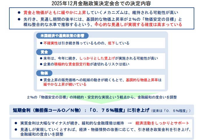 日銀が公表した「2025年12月金融政策決定会合での決定内容」では、「『0.75%程度』に引き上げ」部分の説明(下記参照)として直後に、