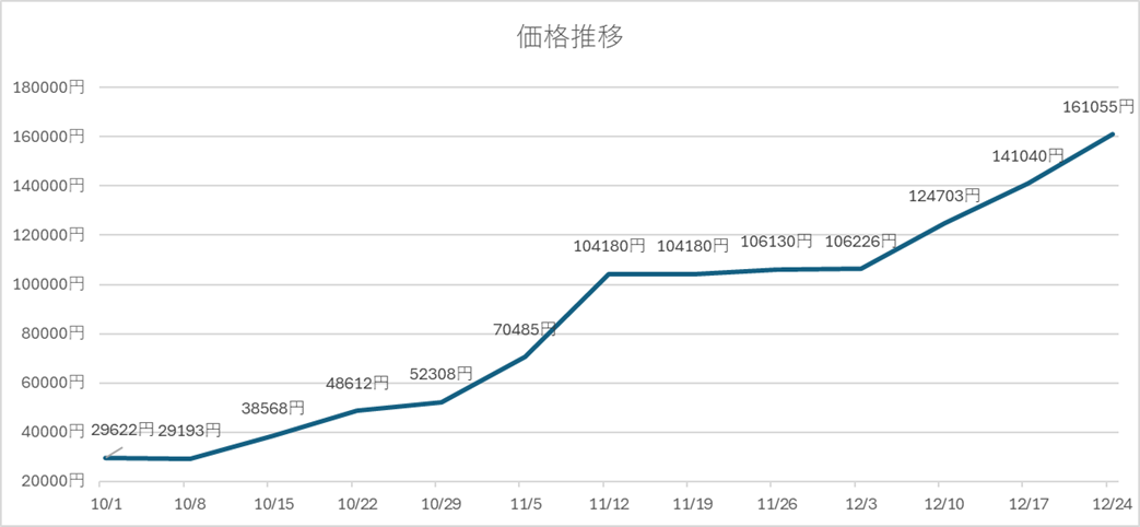 メモリーを増設したことでパソコンが快適になった人も多いと思われますが、昨今の高騰により気軽にできない可能性が出てきました。顕著な値上がりの一例を挙げると、例えばCFD Standard社のメモリー32ギガバイト2枚組(商品名:W5U6400CS-32GC38F)では下のような価格推移となります。