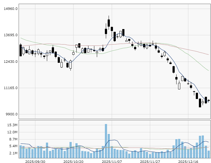 任天堂の株価は足もとさえない展開が続いています。この時期は年末商戦への期待から盛り上がってもいいはずですが、12月22日には10245円まで売られ、今年8月に付けた上場来高値14795円から3割も調整しました。