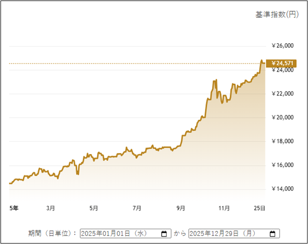 2025年も前年から引き続き伸長した、貴金属の「金」はどうなるのでしょうか。下記チャートのように、1年をかけて多く伸び続けました。
