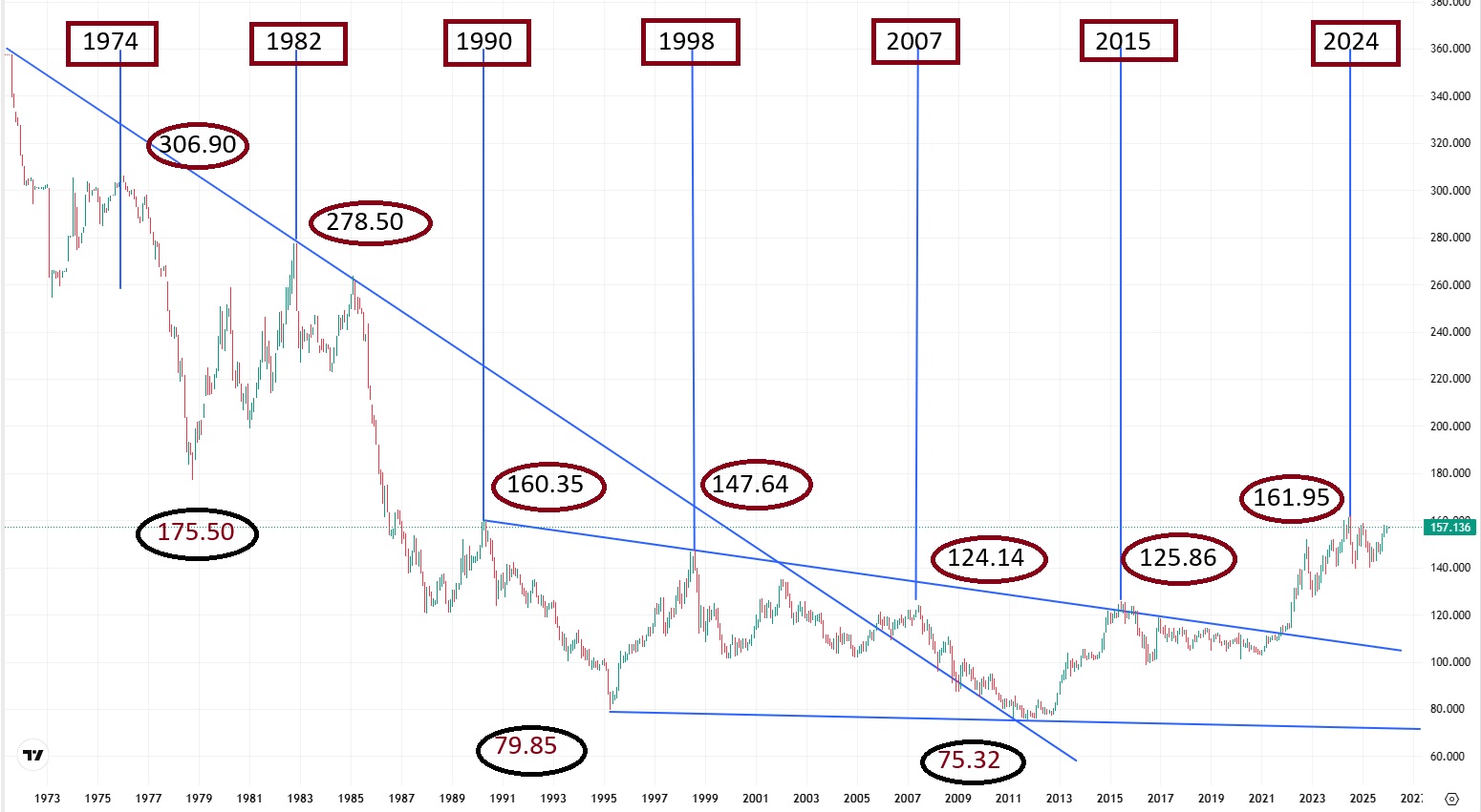 参考までに、次回のドル高・円安8年サイクルは2031-32年での175.50円(※1978年安値)を予想しておきます。