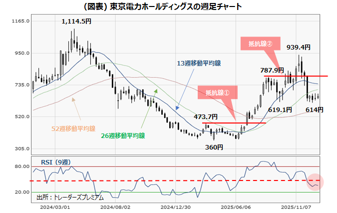 ただ、上回った場合でも、下向きで推移している13週移動平均線に頭を抑えられる可能性が高い点には留意が必要です。また、13週移動平均線を上回った後でも、2025年8月高値(787.9円)水準が抵抗線②として上値を抑えられやすい水準となります。
