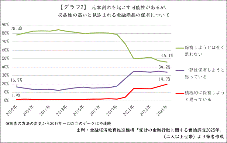 次は、元本割れを起こす可能性がある金融商品の保有について尋ねた結果です。こうした商品についても、「積極的に保有しようと思っている」「一部は保有しようと思っている」と答えた人が上昇傾向で、「保有しようとは全く思わない」という人が減少傾向となっています【グラフ2】。