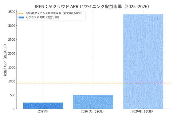 さらに、マイクロソフトとの大型契約に加え、Together AI、Fluidstack、Fireworks AIなどとの複数年契約が進展することで、会社は2026年末のAIクラウド ARRを約34億ドルと見込んでいます。採掘事業の年率換算収益を約9億ドル前後と仮定すると、2026年末にはAIが約78-80%、採掘が約20-22%と、収益構成が逆転する姿が想定されます(いずれも単純試算ベースです)。