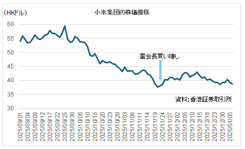中国のスマートフォン大手、小米集団(01810)の株価は昨年9月下旬に付けた高値から約2カ月の間に4割近く下落するなど軟調な値動きが続いていましたが、11月24日に雷軍会長が買い増しに動いたことが明らかになり、翌25日の香港市場では小米集団の株価が一時、6%超上昇しました。この時、雷会長が取得したのは「クラスB」と呼ばれる株式260万株で、1株当たりの平均取得価格は38.58HKドルだったことから、総額1億HKドル超が投入された計算になります。