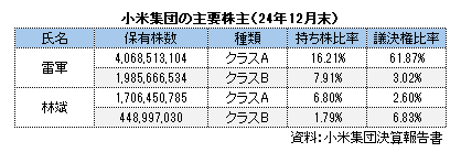 24年12月末時点で雷会長はクラスA株を40億6900万株(発行済み株式総数の16.2%)、クラスB株を19億8600万株(同7.9%)それぞれ保有していることから、持ち株比率はクラスA株とクラスB株の両方合わせて計24.1%となりますが、議決権比率はクラスA株の61.9%とクラスB株の3.0%を合わせると約65%に達し、雷会長が実質的な支配権を握っています。