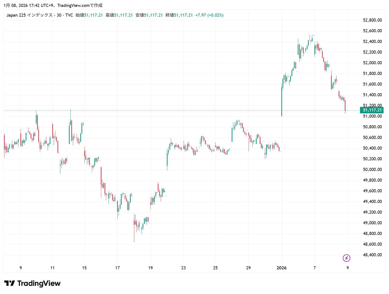 一方の株式相場はどのように反応したのでしょうか。ナスダック・NYダウと日経平均を比較しましたが、いずれも2025年末の高値が年末・年明けに向けて下落基調に入っていたものの、ベネズエラの第一報を受けて日足が上昇しています。
