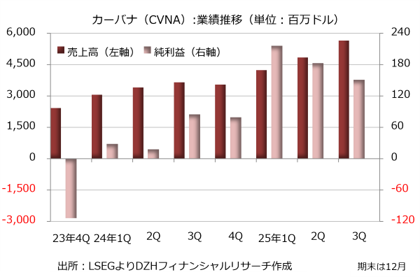 カーバナ(CVNA)は2016年に創業した企業で、中古車売買のEコマース事業を手掛けています。買い手が求める多様な選択肢、高い品質、価格決定の透明性、簡素で負荷のかからない取引などを運営方針に掲げ、業容を拡大させています。
