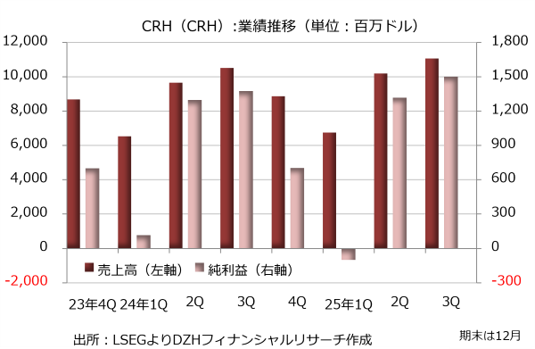 CRH(CRH)は建設資材の製造と販売を手掛けています。骨材、セメント、コンクリート、アスファルトなどの基本資材に加え、建物の建設時に必要な鉄鋼製品なども提供します。
