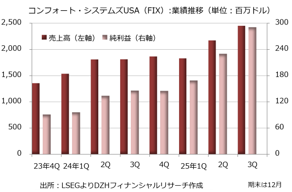 コンフォート・システムズUSAの2024年12月期決算は売上高が前年比35.0%増の70億2700万ドル、純利益が61.5%増の5億2200万ドルと順調に成長しています。