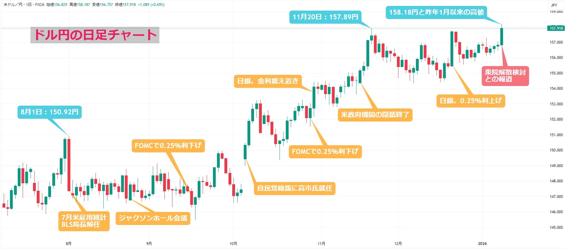ドル円、158.18円と1年ぶり高値