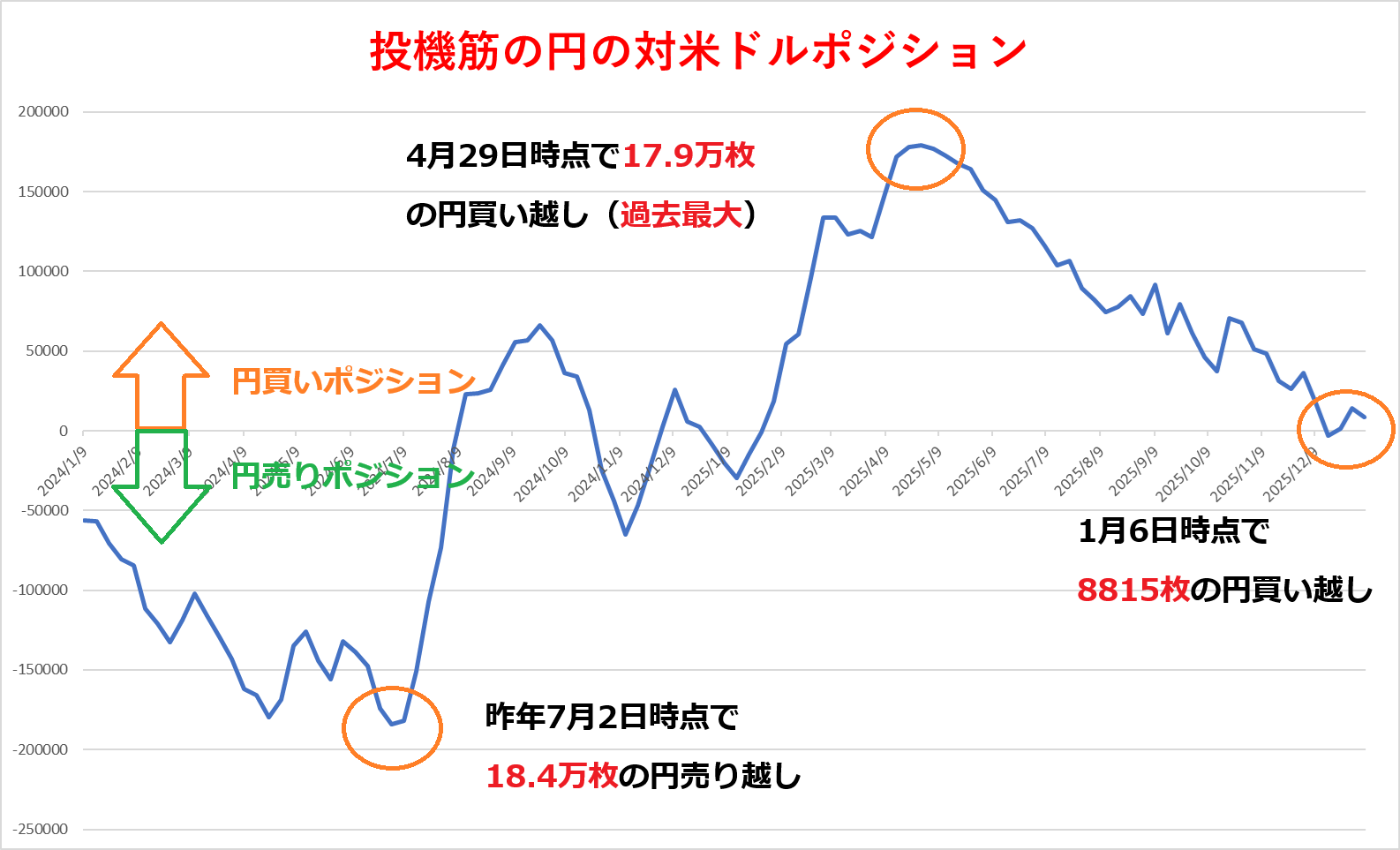 投機筋の円のポジションは昨年7月2日には18万4223枚の円売り越し(ドル円のロング)となり、2007年6月(18万8077枚)以来の高水準を記録していましたが、そのあとは一転して円買いポジションを構築する動きが優勢となり、4月29日には17万9212枚と過去最大を更新しています。ただ、それ以降はその動きが一服し、円買いポジションを縮小する動きに。12月16日時点では円売り越しに転じる場面もありました。現在は8815枚の円買い越しですので、「ほぼフラット」と言っていいでしょう。