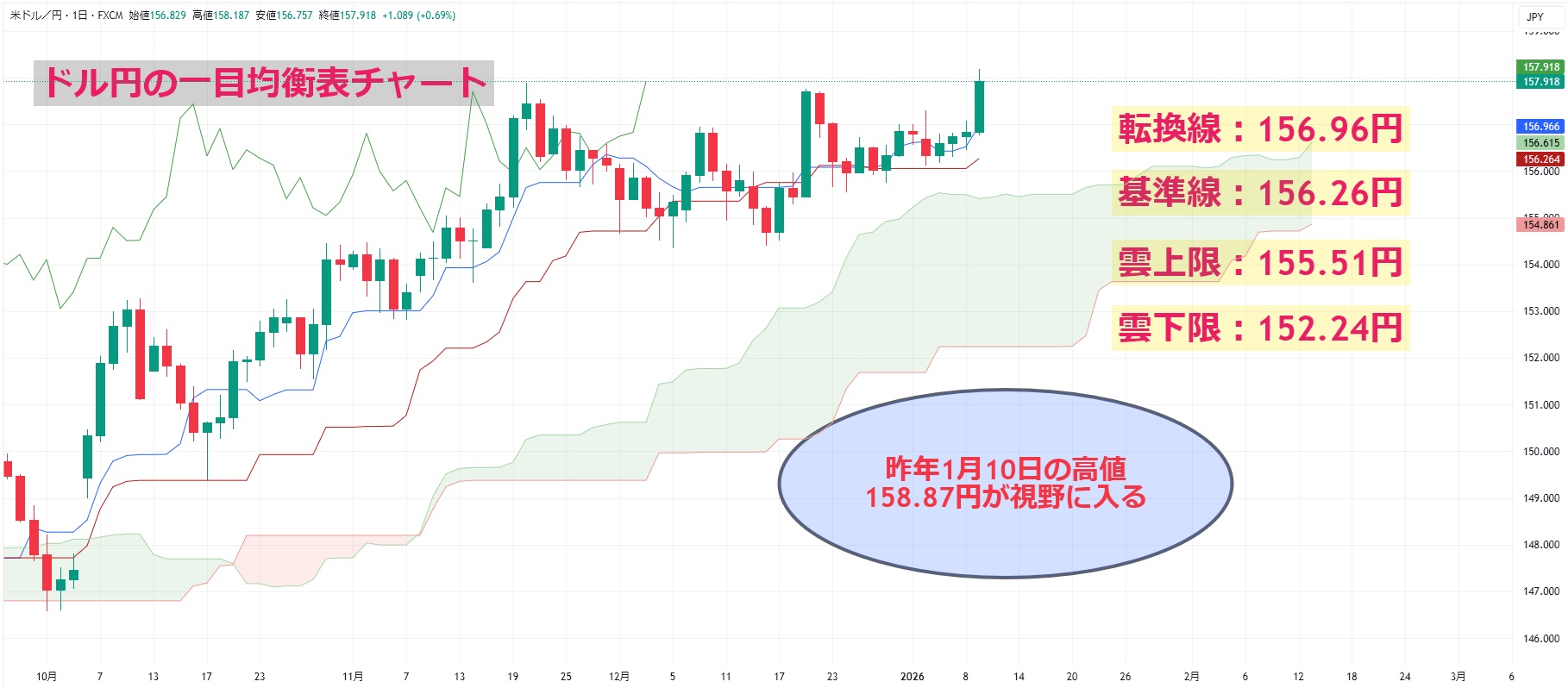 ドル円の一目均衡表チャートを見ると、週末の終値(157.89円)で転換線(156.96円)や基準線(156.26円)、雲(上限:155.51円、下限:152.24円)を全て上回っており、テクニカル的に底堅い展開が予想されます。また、マクロファンドなどが重要視している50日移動平均線が位置する155.24円も引き続き上回っており、上サイドへの期待が高まります。