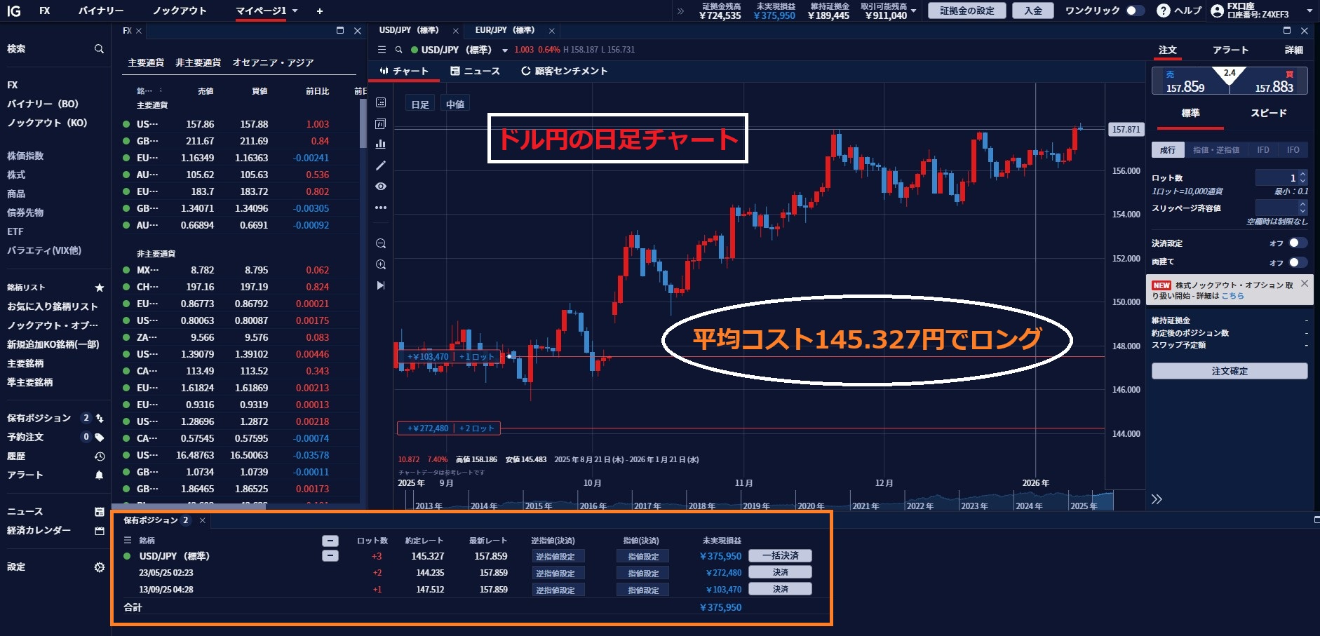 なお、現在の私のポジションはドル円ロング@145.327円。政府・日銀による為替介入への警戒感は根強いですが、基本的には上サイドを目指す展開が予想されます。昨年1月10日の高値158.87円はすでに視野に入っていますが、この水準を上抜けた場合は節目の160円突破も想定されます。