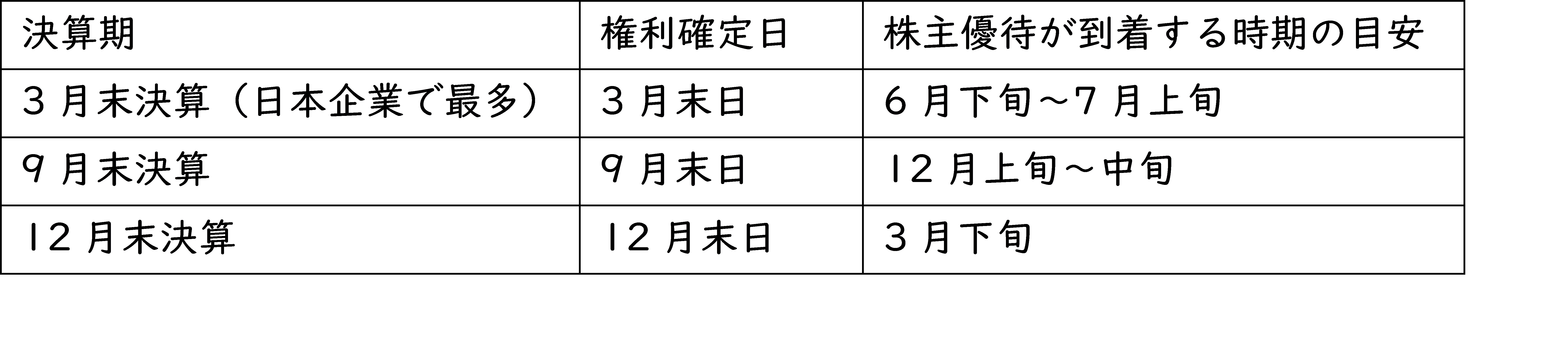 上記のような疑問や不安を抱く方は多いでしょう。株主優待が手元に届くまでには、権利確定日から約2~3カ月が一般的な目安です。