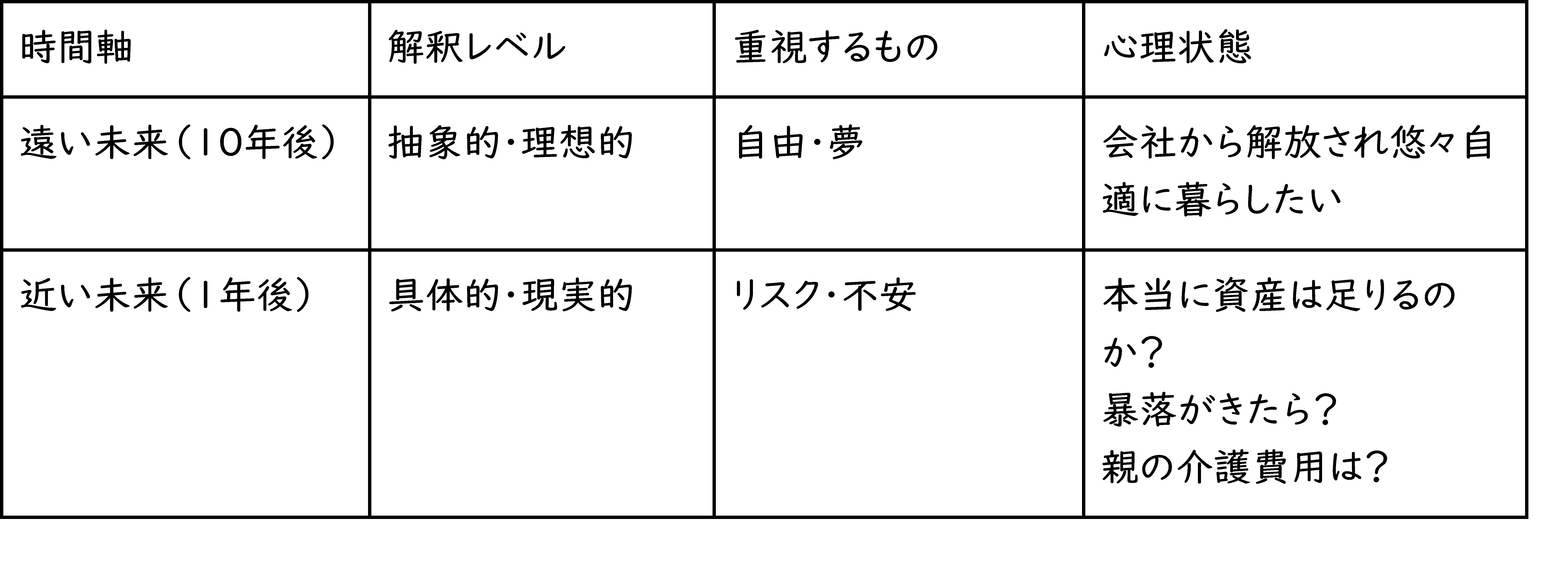 ゴール直前であと1年だけと考えてしまうのは、心理学で説明できます。これは目標への心理的距離によって、物事の捉え方が変わるという理論です。