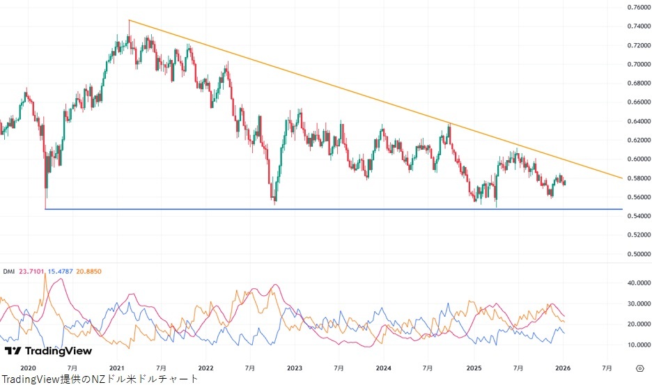 NZドル米ドルの週足分析:「三角保ち合い」が継続中