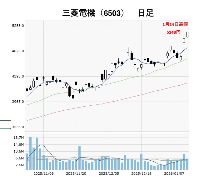 これらは、そのテーマが盛り上がっている際には目を見張る上昇となることもある一方、ブームが去った際の落ち込み度合いが急になることもあります。その点、三菱電機は特定のテーマを材料に強く買われることは少なくても、そのテーマが終わっても別のテーマで買われる要素があるだけに、売られづらい銘柄になっていると言えます。AI関連に高値警戒感が出てきた時に防衛関連が資金の受け皿になることもありますので、足元では大きく失速することなく強い基調が続いています。
