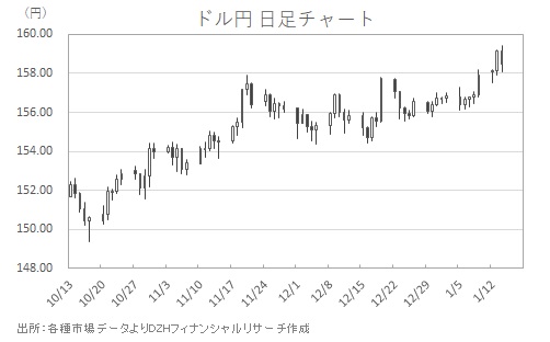 1月9日、「高市首相が『衆院解散』検討に入った」との報道を受け、円売りが一気に強まりました。その後もドル円は上昇が続き、2024年7月以来の159円台に達しています(図表参照)。高市政権が高支持率を維持するなかで衆院選に勝利すれば、積極財政が進むとの思惑が背景にあります。