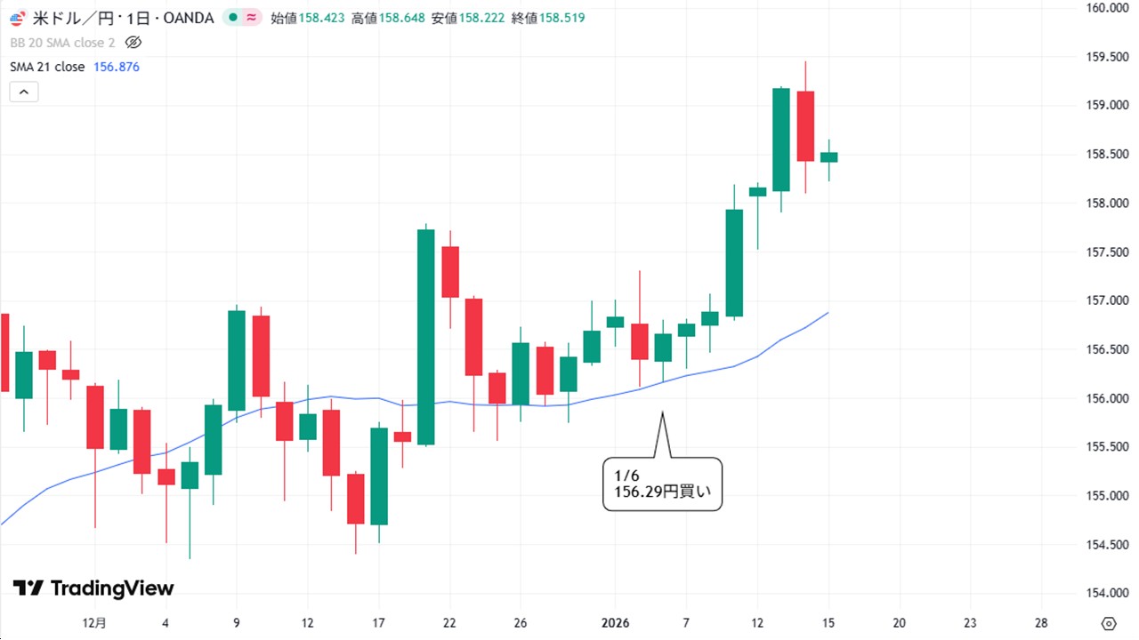 ドル円、昨日下押すも緩やかだが上向きの21日線を前に底堅さが見られたので、現在レート156.29円で試しに買ってみる。ストップは21日線のやや下155.95円。