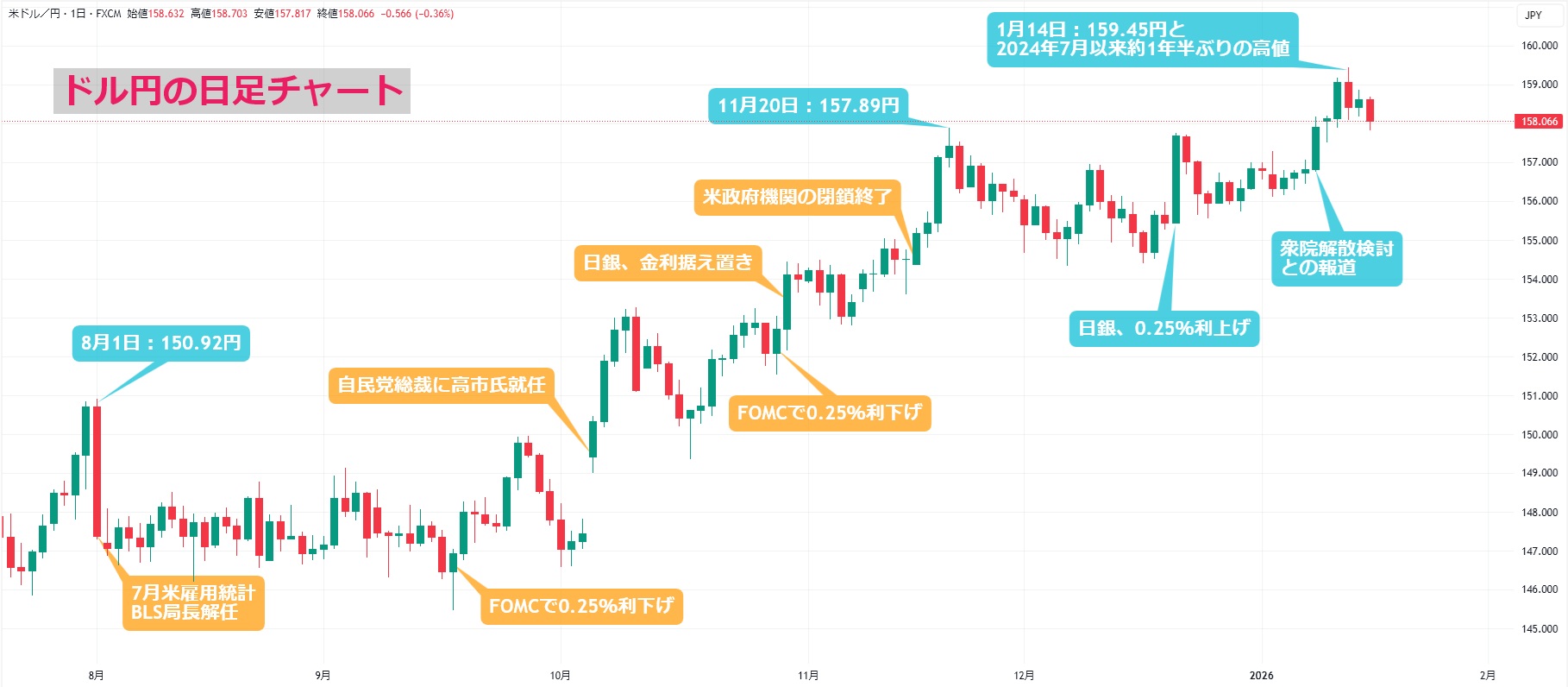 今週のドル円は底堅い展開となりました。前週末9日に読売新聞が「高市首相は23日召集予定の通常国会冒頭で衆院解散を検討」「衆院選は2月上中旬に実施される公算が大きい」と報じたことをきっかけに円売りが強まりましたが、今週もその流れを継続。読売新聞以外も衆院解散を報じました。