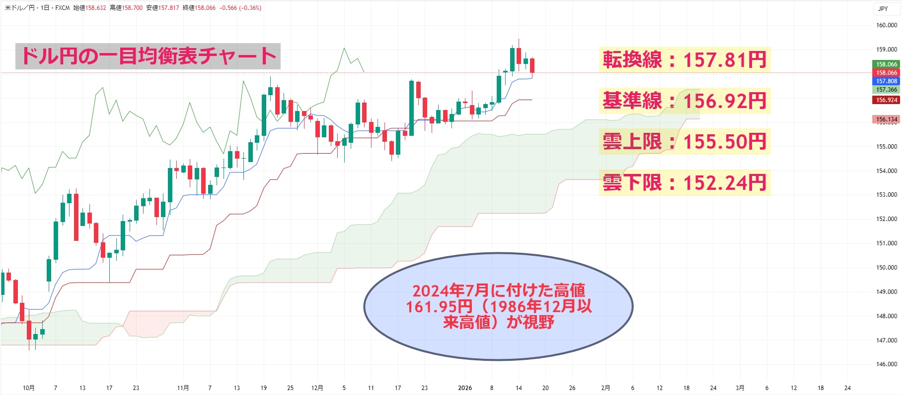 ドル円の一目均衡表チャートを見ると、週末の終値(158.12円)で転換線(157.81円)や基準線(156.92円)、雲(上限:155.50円、下限:152.24円)を全て上回っており、テクニカル的に底堅い展開が予想されます。また、マクロファンドなどが重要視している50日移動平均線が位置する155.82円も引き続き上回っており、上サイドへの期待が高まります。