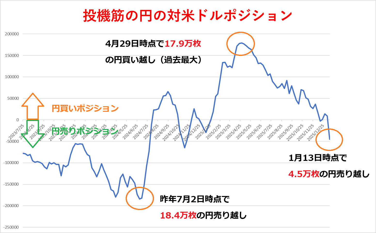 投機筋の円のポジションは昨年7月2日には18万4223枚の円売り越し(ドル円のロング)となり、2007年6月(18万8077枚)以来の高水準を記録していましたが、そのあとは一転して円買いポジションを構築する動きが優勢となり、4月29日には17万9212枚と過去最大を更新しています。ただ、それ以降はその動きが一服し、円買いポジションを縮小する動きに。1月13日時点では大幅な円売り越しとなりました。