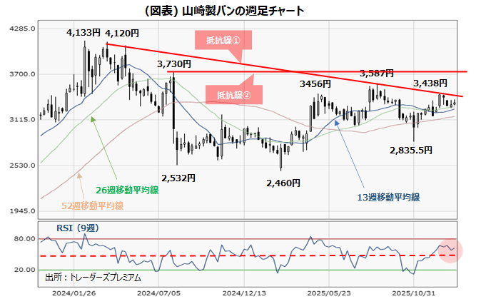 図表は、山崎製パン(2212)の2023年12月頃からの週足のローソク足に加え、13週・26週・52週移動平均線を挿入したチャートです。