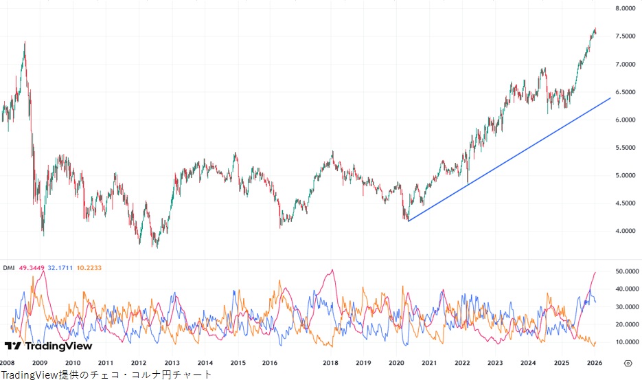 コルナ円は2020年5月安値を始点とする上昇トレンド(チャート上の青色実線)にあり、昨年11月には2008年7月につけた史上最高値7.40円を上抜けました。今年の1月に入って7.66円まで史上最高値を更新しています。