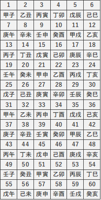 干支は12年で一周しますが、さらに細分化すると60年で一周することになります。干支は十干(じっかん:甲 乙 丙 丁 戊 己 庚 辛 壬 癸)10種類と十二支(じゅうにし:子 丑 寅 卯 辰 巳 午 未 申 酉 戌 亥)12種類を組み合わせて年を数える仕組みで、10と12の組み合わせが元の並びに戻る最小周期が最小公倍数の60です。