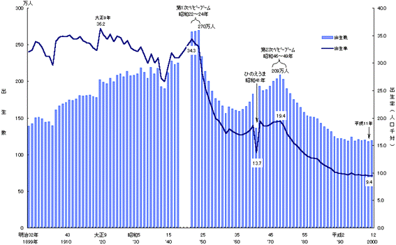上のグラフを見ると1966年(昭和41年)の出生数ががっつり減っていることが分かります。「ひのえうま」としっかり書かれていますね。この年は出産を前年か翌年にずらす、妊娠自体を避けるといった動きが顕著だったようです。