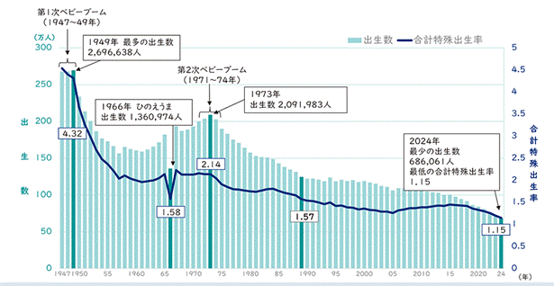 前述のように丙午だった1966年は特殊な事例でしたが、1970年台後半から出生数は再び減少。2024年の出生数は68万人台となり、統計開始後で最低の記録になりました。1966年のおおよそ半分しかありません。