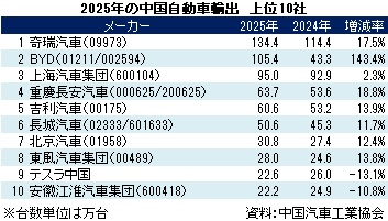 メーカー別の輸出台数ランキングをみても、新エネルギー車の成長は明らかです。電気自動車(EV)世界最大手となったBYD(01211/002594)は、25年に前年比143.4%増の105万4000台を輸出。順位は前年の6位から2位に上昇し、輸出市場で長年トップを走る奇瑞汽車(09973)に接近しました。BYDと米テスラの中国法人を除けば上位10社は伝統燃料車を主力としてきたメーカーで占められており、BYDの伸長が目立ちます。