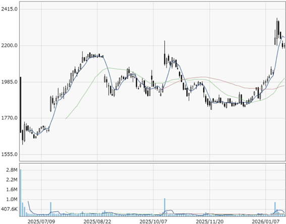 この決算を受けた翌営業日(1月15日)の株価は買いで反応。終値は2245円(前日比194円高)となりました。翌16日には上値を2364円まで伸ばし、これが現時点(2026年1月22日)の上場来高値となっています。