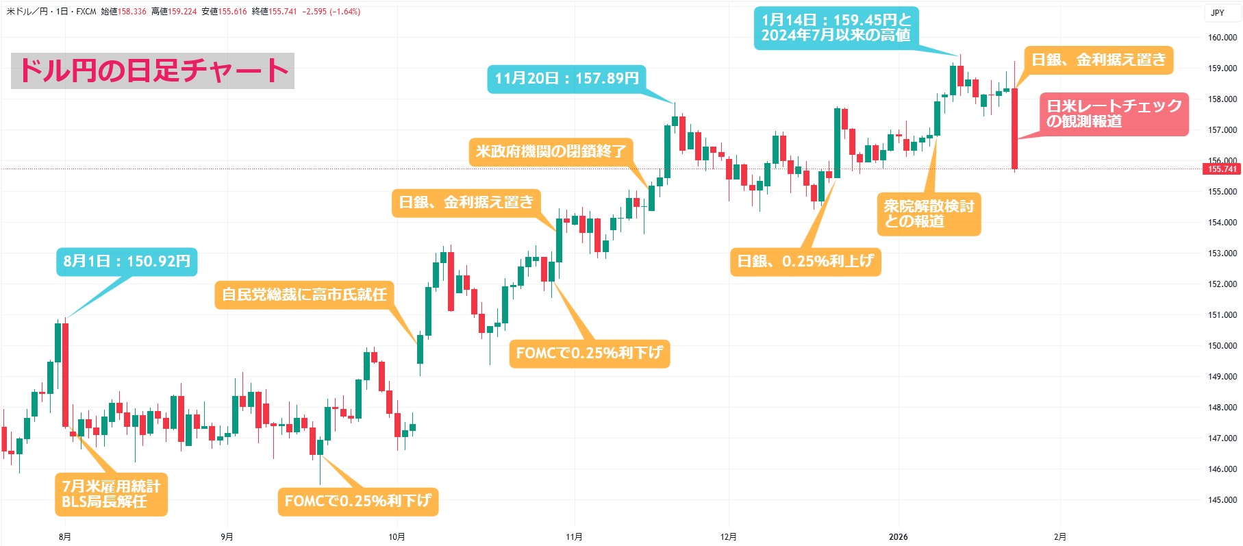 今週のドル円は週末の動きがすべてを物語っていますが、週前半から半ばにかけても色々と材料はありました。トランプ大統領は21日、米国によるデンマーク自治領グリーンランドの取得を巡って、対立する欧州8カ国に対して2月1日から発動を予定していた追加関税を課さないと表明。武力を行使しない方針も明らかにしました。グリーンランド問題を背景とした米欧対立激化への懸念はひとまず和らぎ、投資家心理は改善。世界的に株高が進むと同時に、為替市場では円安が進行しました。ユーロ円は連日でユーロ導入以来の高値を更新したほか、スイスフラン円も史上最高値を付けています。