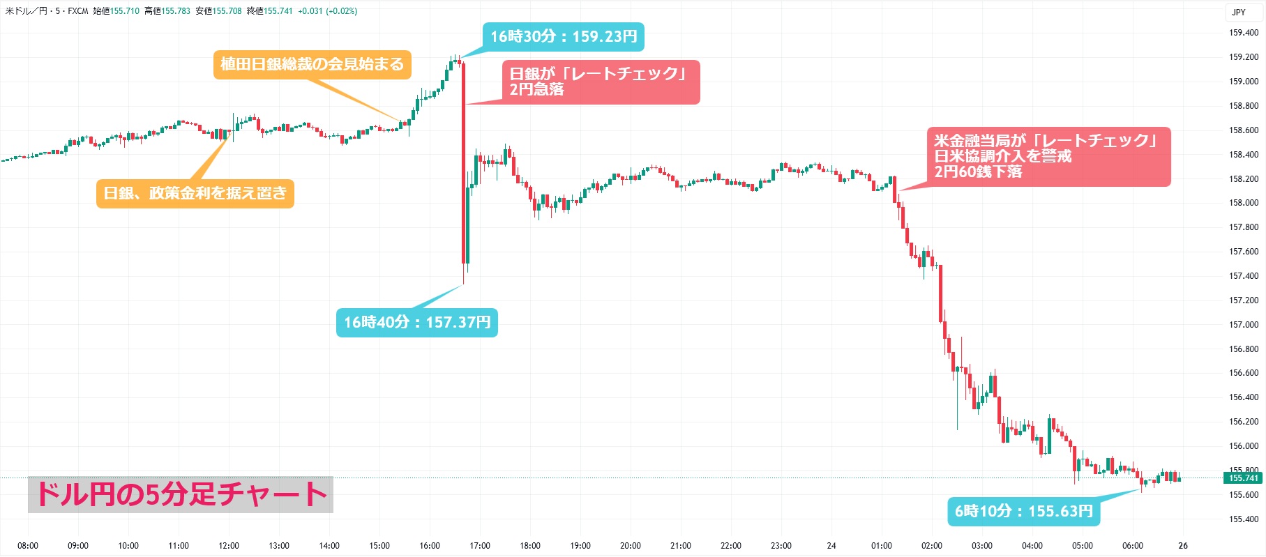 ただ、そのあとは一転下落し157.37円まで大きく値を下げました。市場では「欧州時間に入り欧州の投資家から大口の利食い売りなどが出た」「2022年9月の動きと似ており、政府・日銀による為替介入への警戒感が高まっていたところに大きな売りが出た。ストップロス注文を巻き込んで値動きが大きくなった」との声が聞かれたほか、「政府・日銀が為替介入の前段階となる『レートチェック』を行った」との見方も出ていました。そのあとは158円台半ばまで急速に下げ渋り、しばらくは158円台前半でのもみ合いが続いていましたが、NY市場に入ると再び売りが優勢に。日本時間1時頃から断続的に円買い・ドル売りのフローが観測されたことで、終始軟調な展開となり、6時過ぎに一時155.63円まで値を下げています。「米財務省の指示で米連邦準備理事会(FRB)が『レートチェック』を行った」との報道も伝わり、市場の一部では「日米が協調して介入する可能性も意識されている」との声が聞かれています。