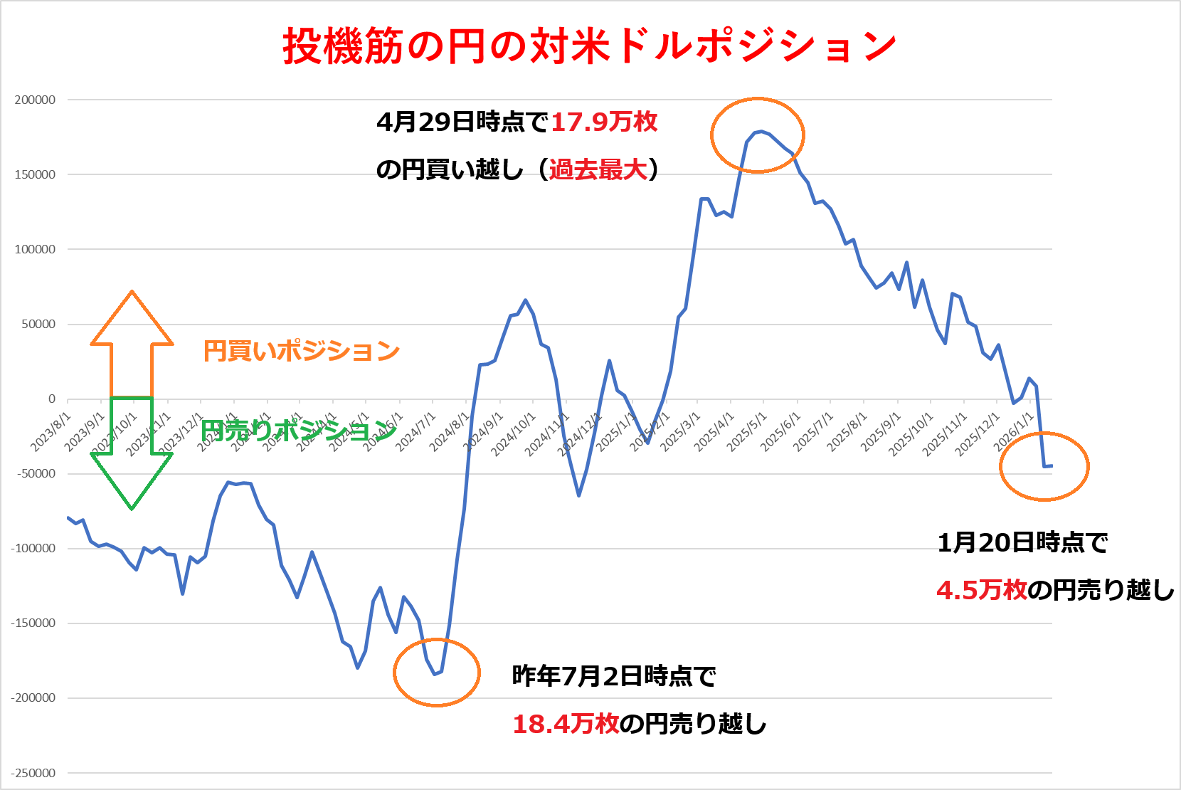 投機筋の円のポジションは昨年7月2日には18万4223枚の円売り越し(ドル円のロング)となり、2007年6月(18万8077枚)以来の高水準を記録していましたが、そのあとは一転して円買いポジションを構築する動きが優勢となり、4月29日には17万9212枚と過去最大を更新しています。ただ、それ以降はその動きが反転し、再び円売りポジションに。1月20日時点では大幅な円売りポジションが維持されています。