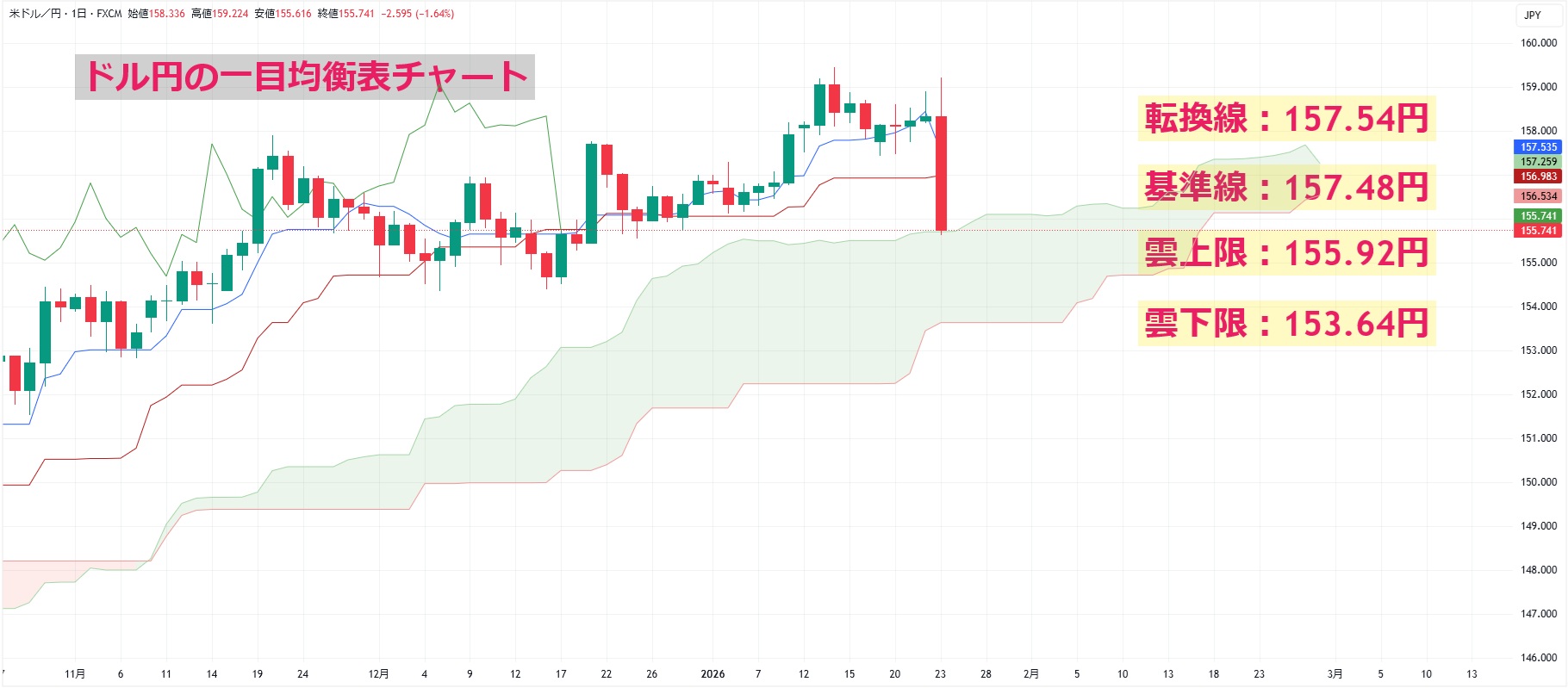 ドル円の一目均衡表チャートを見ると、週末の終値(155.70円)で転換線(157.54円)や基準線(157.48円)、雲上限(155.92円)を下回りました。テクニカル的には上値が重い展開が予想されます。
